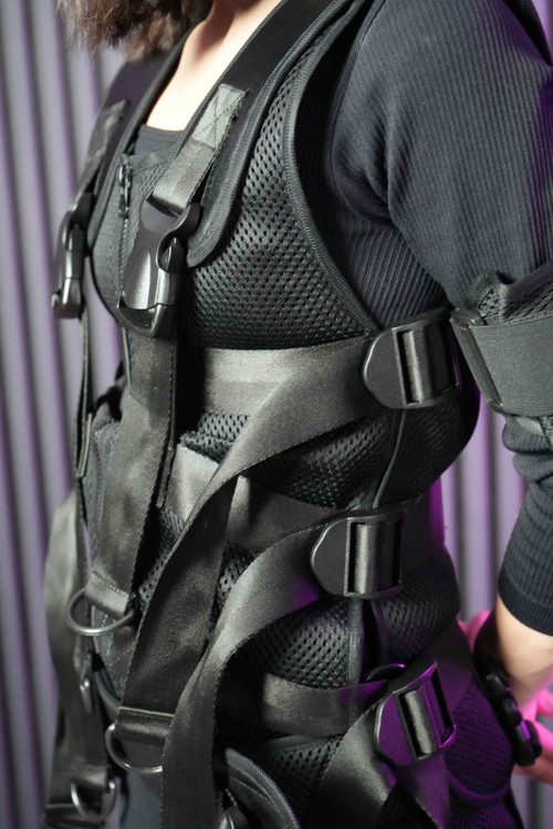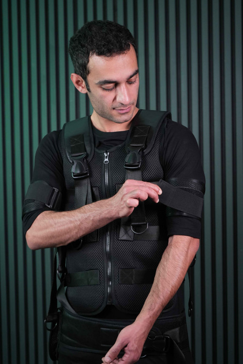 🔹 جلیقه EMS تایتان، دارای بندهای قابل تنظیم در قسمتهای مختلف بدن است، که امکان تطبیق آن را با سایزهای مختلف فراهم میکند.
